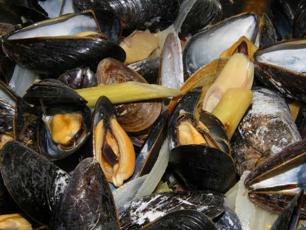 Scrub limpiamos mejillones, lavar, llevar barbas si había cualquiera, desechar los rotos y los abrieron