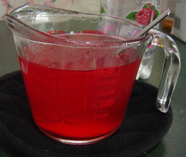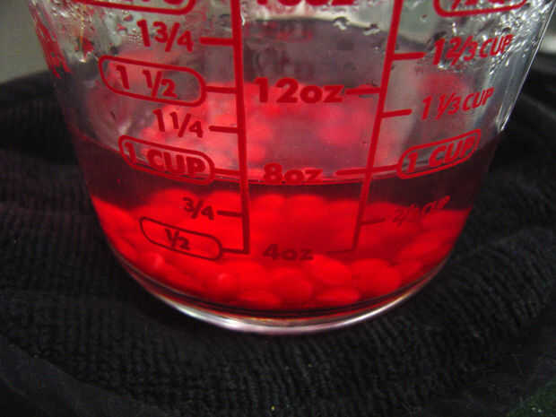 Agregue lentamente 1 taza de agua fría a la mezcla de pastillitas rojas.