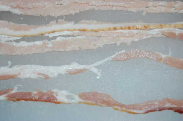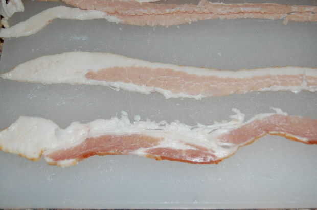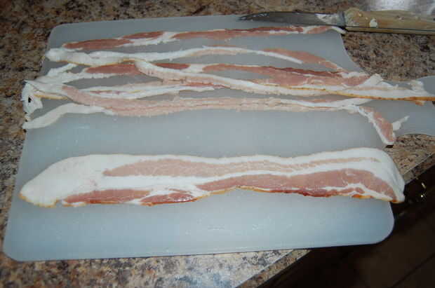 No quiero un trozo enorme de tocino para trabajar, así que lo corte en tiras finas. Cortarlo por la mitad y luego en cuartos. No es la cosa más fácil del mundo para cortar el tocino en tiras finas, pero con un poco de trabajo cuidadoso puede hacerlo. Guardé las tiras largas, pero consiguen frágil después de la cocción y sobre todo rompieron por la mitad de mí de todos modos. Por cortarlos por la mitad luego también haría más fácil de manejar en las etapas de inmersión, por lo que probablemente iría de esa manera la próxima vez.