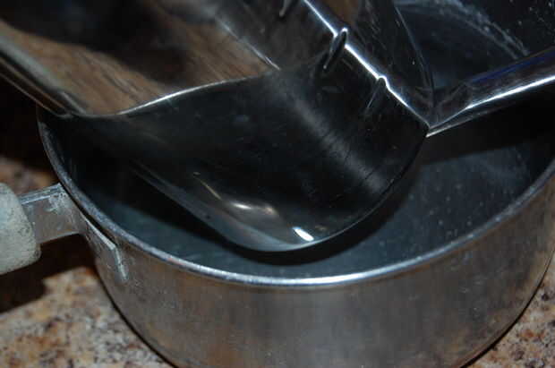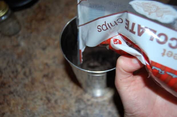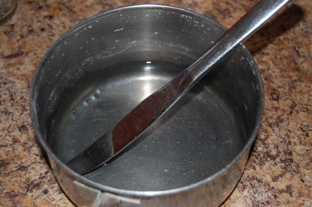 Llene la parte inferior de la caldera con sólo una pulgada o tan de agua. Ahora, ya que no tengo una caldera doble, encontré que era un poco provechoso al meter un cuchillo hacia abajo en el agua para mantener mi copa de metal. Esto mantiene el chocolate encima de calor para ayudar a de cocinarlo en exceso el chocolate. No funcionaba por lo grande mientras se intentaban mezclar el chocolate, pero mientras está calentando el agua funciona bien.