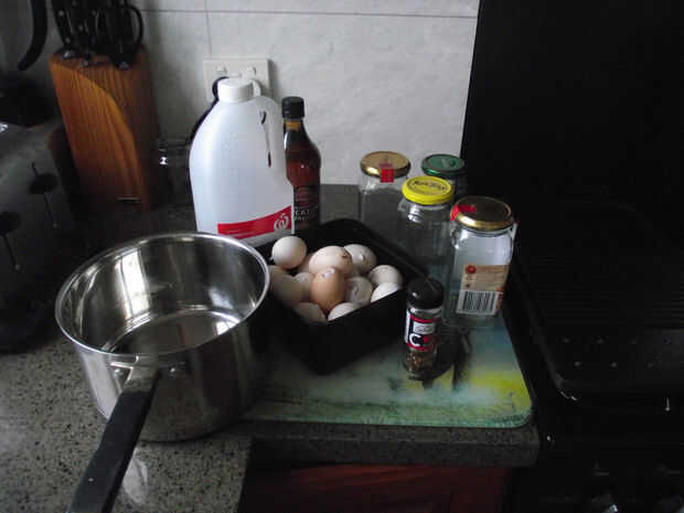 Huevos (obviamente) estoy usando los huevos de gallos ya que son un buen tamaño y absorber las especias de conserva en vinagre más rápidas que los huevos de tamaño completos (también los de tamaño completos son enormes)