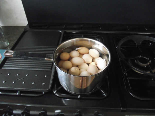 Hervir durante unos 10 minutos, lo ideal sería utilizar huevos que están a pocos días de edad como pelan más fácilmente.