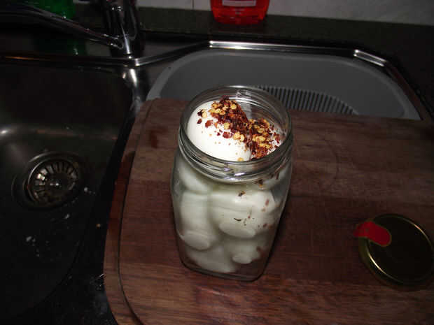 Picante conservado en vinagre huevos (4 / 5 paso)