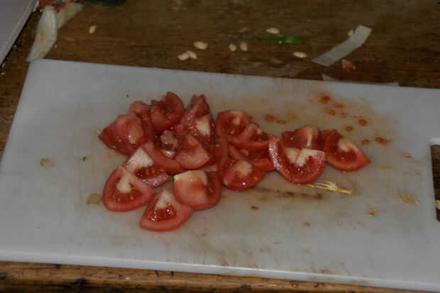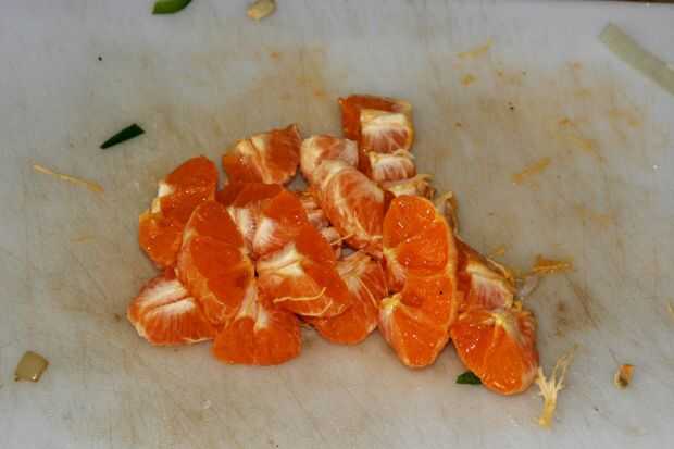 Los tomates pueden ser picados aproximadamente en octavos. La forma de parto las clementinas es pelarlas, luego cortarlas en medio 'Ecuatorial' - es decir, con el extremo del tallo en la mitad y el otro extremo en la otra mitad. Una vez hecho esto, puede romper en trozos y exprimir las pepitas hacia fuera fácilmente con los dedos.