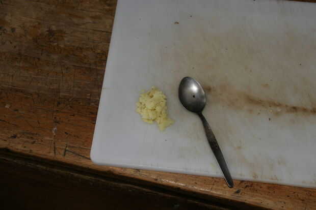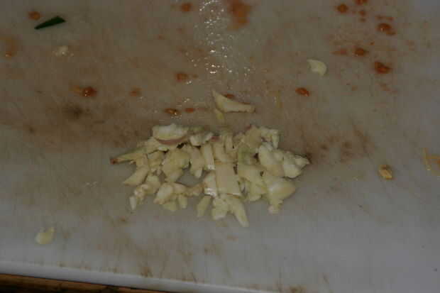 El jengibre y el ajo deben aplastados con la parte plana de un cuchillo, luego picados finamente. Puso un cuchillo sobre el ajo, hace un puño y golpeó la parte plana de la cuchilla con el lado de su puño (como está golpeando en la mesa, no como usted está golpeando a alguien!). El ajo Pela muy bien después de que lo hayas hecho.