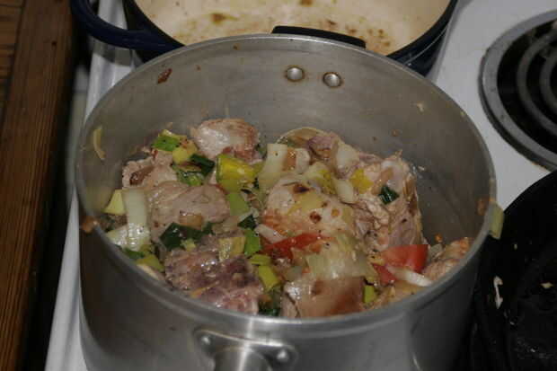 Una vez que la carne está dorada, puede Agregar esto y los tomates, el puerro y clementinas a la olla. Luego añada suficiente agua para casi cubrir los ingredientes.