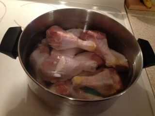 Lugar pedazos de pollo en una gran ebullición olla y llevar a hervir, reduzca el calor a SMMER durante 30 minutos o un poco más de ternura más.