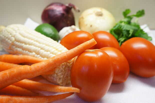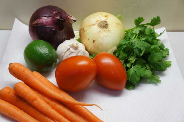 Me precocidos ingredientes en el tazón de fuente caliente, zanahorias, apio y maíz y normalmente agregar frijoles cocidos, para Chile perfecto de mi esposo. Le gusta poner en la parte superior de una papa al horno con crema agria y cilantro fresco cebolla y queso cheddar.