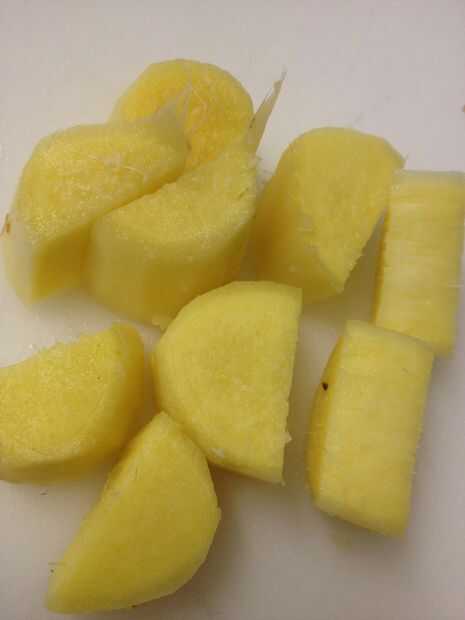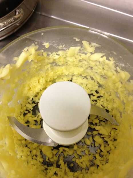 Pela toda la piel del jengibre y cortar en varios trozos.  Poner en la picadora y pulse en trozos finos.  Si se utiliza un cuchillo fino, picar el jengibre. Ponga a un lado.