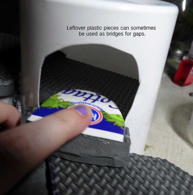 Me di cuenta de que la segunda entrada principal de la planta también podría utilizar una transición más suave, así que corte un pedazo de otro retal de puerta utilizar allí. Dispensar una capa fina de pegamento caliente en la parte inferior del plástico, y luego presione en su lugar.