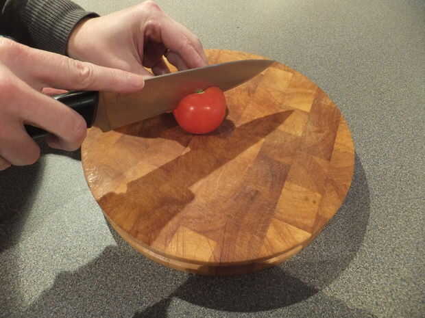 - Cortar el tomate, la hoja va más allá de la mitad otra vez, pero en el otro lado