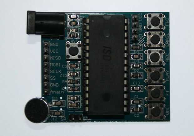 El módulo de ISD1760 como se muestra en la foto le permite grabar cualquier cantidad de mensajes con una longitud total de mensajes de entre 40 y 120 segundos dependiendo de la frecuencia de muestreo. Puede usar cualquiera los botones manuales en el módulo o en el bus SPI (interfaz periférica Serial) para ello.