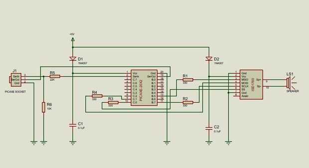 Una parte muy importante de este circuito es el uso de los diodos D1 y D2. NO tener la tentación de omitir estos. A primera vista parecen no servir a ningún propósito. Hay una razón muy importante que están ahí. Cuando primero es conectar ambos el ISD1760 y el PICAXE 20 X 2 a la misma batería, el PICAXE 20 X 2 dejar de trabajar y encontré no podría nunca programar otra vez. Soplé varios I.Cs de 20 X 2 (por $5 pop) antes de descubrir que sólo conectar ambos a la misma batería dañaría el 20 X 2. Sólo puedo concluir que el ISD1760 está poniendo algunos puntos desagradables en el riel de alimentación, aunque yo no era capaz de ver en un ámbito de aplicación. Determiné que usando baterías separadas con una tierra común o usando los diodos D1 y D2 para aislar la energía previene este problema.