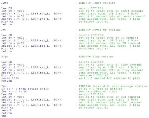 El programa se muestra en las imágenes adjuntas y también está incluido en el archivo zip en el ultimo paso de ISD1760.bas. Este programa está diseñado para leer el mensaje "94.1 FM" de varios clips de sonido independientes. Sin embargo una vez que entienda cómo funciona el programa, usted puede modificarlo para leer todo lo que quieras.