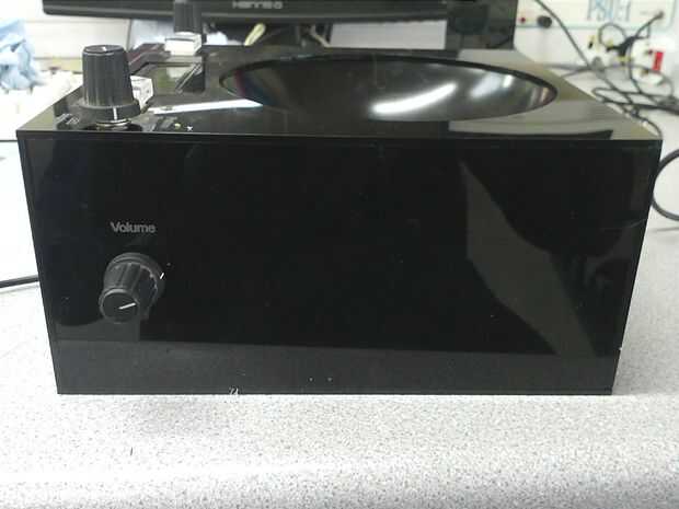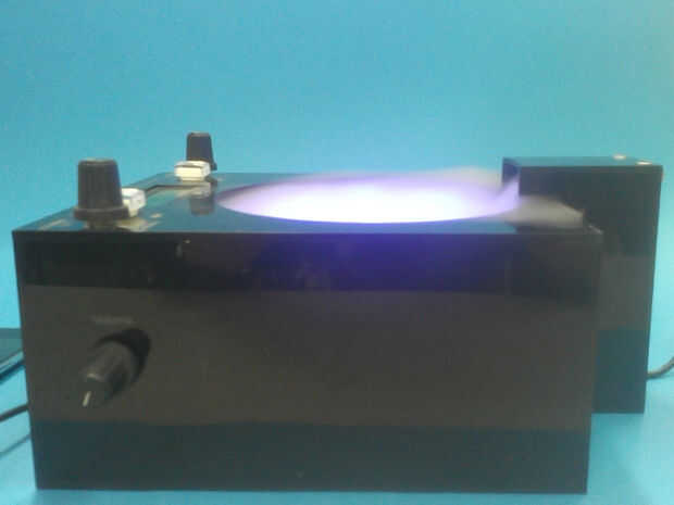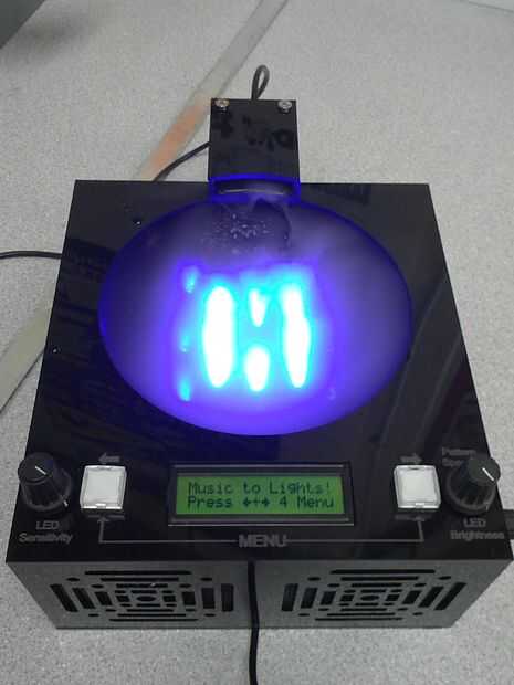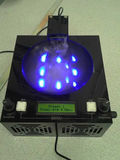 2. con la ayuda de un Picaxe 18 M 2 microcontrolador, este dispositivo, mientras que amplifica tu música, también parpadea anillos de LEDs para el 'beat' de la música, similar a un vúmetro, la sensibilidad y el brillo de ante los LED la música pueden ser controlados mediante dos perillas de control (potenciómetro). Esta luz de los LEDs es proyectada a través de una capa de niebla densa que está siendo producido por un nebulizador ultrasónico alimentado por agua ordinaria en el cuadro de independiente en la parte posterior de la unidad que 'vierte' la niebla en el tazón de fuente.
