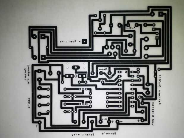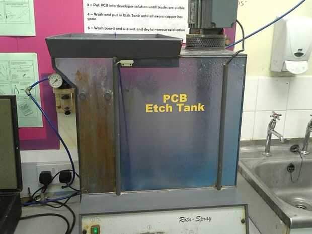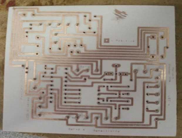 El diseño del circuito entonces se imprime en papel de transparencia este papel entonces fue colocado en una caja de luz con una hoja en blanco fotosensible del tablero del PWB en la parte superior y la caja de luz fue encendida durante 1 minuto. La luz ultravioleta reacciona con la capa fotosensible de las partes de la placa de circuito en blanco que se ha sometido a, esta reacción permite la capa fotosensible que estuvo expuesta a la luz UV quitarse con un desarrollador que reveló el cobre en una imagen negativa del diseño final por debajo, esto ahora cobre visible es entonces grabado al agua fuerte lejos en un tanque grabado PCB revelando el final diseño de PCB , el PCB entonces se lija para quitar el resto de la capa fotosensible que no fue sometido a la luz mostrando el cobre por debajo.