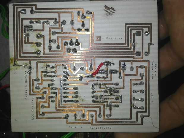 Como los componentes utiliza en el circuito son componentes de 'hueco', el PCB tuvieron que ser perforados para permitir que la población y soldar los componentes a la placa de circuito, usa un taladro de columna para broca de precisión y un 1mm. Los componentes se sueldan luego en el uso de un soldador y soldadura y se cortan los cables de exceso de los componentes.