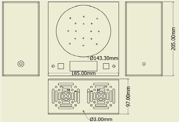 decidí diseñar la carcasa en AutoDesk inventor que aunque es un programa de diseño 3D y sólo necesitaba un programa de diseño 2D como pretendo láser cortar el diseño en acrílico de 3 mm, este programa tenía la ventaja de poder montar virtualmente cada láser corte cara para comprobar el ajuste final y apariencia. El viejo diseño de cubierta inicial implicó el nebulizador y reserva de agua necesaria para la creación de la niebla para estar dentro de la unidad principal como se puede ver en la foto primera de arriba sin embargo más lejos en el proyecto me di cuenta de esto sería difícil de fabricar por lo que en el diseño final del atomizador y el depósito de agua ahora en una caja aparte que 'vierte' niebla en el tazón de fuente como se puede ver en la imagen segunda y tercera.