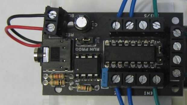 Puente H1 es más cercano al conector circular de programación. Establecer este puente 'PROG' cuando desea programar la placa, o 'Ejecutar' cuando quiere operar el robot. Seleccione 'PROG' por ahora.