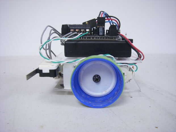 Ahora utilice la cinta de espuma de doble cara para sujetar la placa PICAXE a la parte superior del soporte de la batería. La toma de programación alrededor de la placa PICAXE debe quedar hacia la parte posterior del robot.