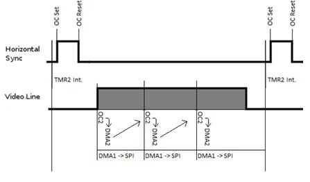 Con estas dos señales sincronizadas correctamente ya tenemos un marco sincronizado. Nuevo tenemos que pintar la imagen. El módulo SPI se utiliza para serializar una palabra (16 bits) poco a poco a través de un pin del micro. Cargar el módulo directamente llevaría casi todo el tiempo de procesador y no sería viable. Un canal DMA se utiliza para transferir un búfer pequeño 'línea' para cada línea a ser serializado (leer 'pulso de sincronismo horizontal'). El buffer debe ser cargado de partida del búfer vídeo antes de cada línea en la rutina de interrupción de TMR2, que sucede justo antes de una nueva línea. Y antes de cada transferencia de DMA debe activarse en el momento adecuado para empezar a serializar los bits.