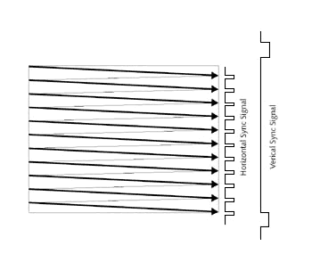 Debemos generar la señal de vídeo se compone de tres partes: la señal de sincronismo horizontal (TTL 0v - 5v), sincronización Vertical (TTL 0v - 5v) y las señales de tres colores (rojo verde azul, analógica 0v - 0.7v). La imagen es elegida para ser monocromático, las tres líneas de color se unen como sólo pueden asumir dos niveles. Las capturas de pantalla la imagen recibida pasada se guarda internamente y mostrar en la pantalla del monitor, cada una de estas imágenes se llama un marco. Nuestra misión es crear estos marcos en la frecuencia que el monitor consuma. Las imágenes están 'pintadas' en la pantalla como se muestra en la primera imagen, línea por línea, de izquierda a derecha, solo como lectura.