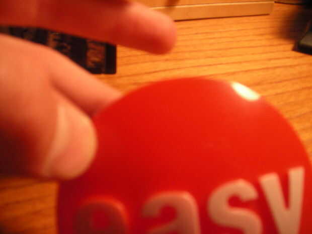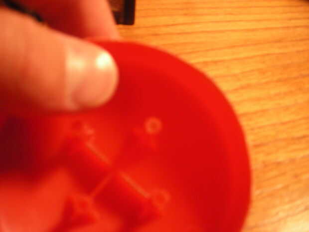 Ahora, cambiar a la mitad superior, el botón principal impreso con fácil y el anillo de plata. Corte el borde de la pequeña en el botón rojo con sus tijeras. Asegúrese de que se desliza dentro y fuera del anillo de plata de ambos lados.