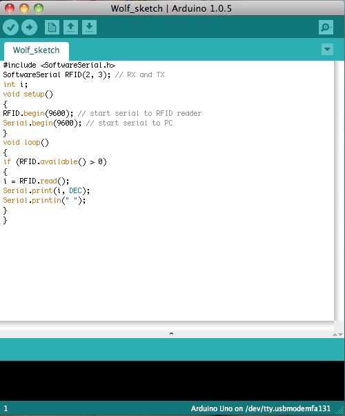 #include<SoftwareSerial.h> SoftwareSerial RFID(2,3);//RX and TX int i; void setup() { RFID.begin(9600);//start serial to RFID reader Serial.begin(9600);//start serial to PC } void loop() { if (RFID.available()>0) { i=RFID.read(); Serial.print(i, DEC); Serial.PrintIn(" "); } }