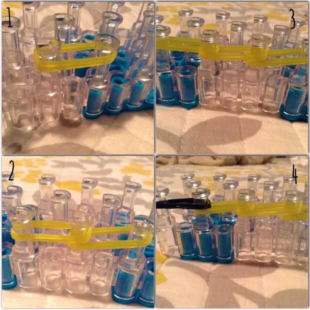Tomar dos bandas de goma amarillo. Utilizaré a arco iris telar marca gomas, que son muy resistentes. La razón que me encanta utilizar bandas doble es que si una de tus bandas de goma se rompe, no tienes que preocuparte porque no hay otra banda de goma. Bajar de nuevo con dos bandas amarillas, entonces otra vez. Utilice doble bandas negras para el lóbulo de su oreja.