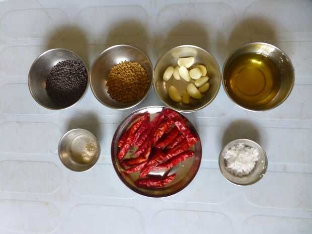 1 kg raw mango150 gm de dividir las semillas de mostaza100gm de dividir las semillas de alholvaPaso 1:semillas de hinojo 50 gm (tierra corasly)semillas de chernushki 50gm4 cucharaditas polvo de Chile rojo (Cachemira)Paso 2:2 cucharadas de cúrcuma1 ta