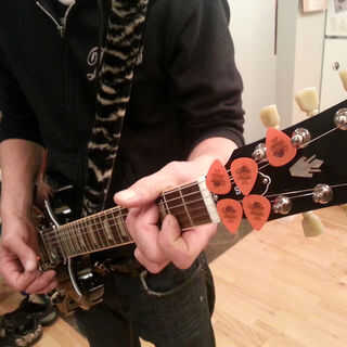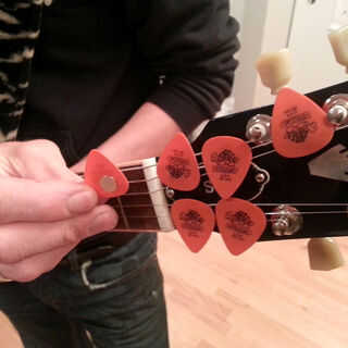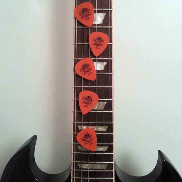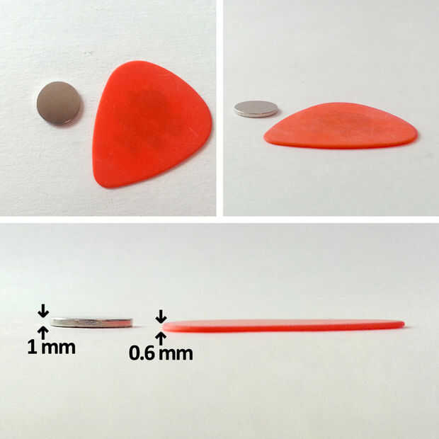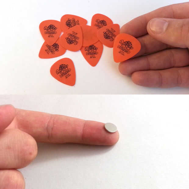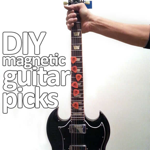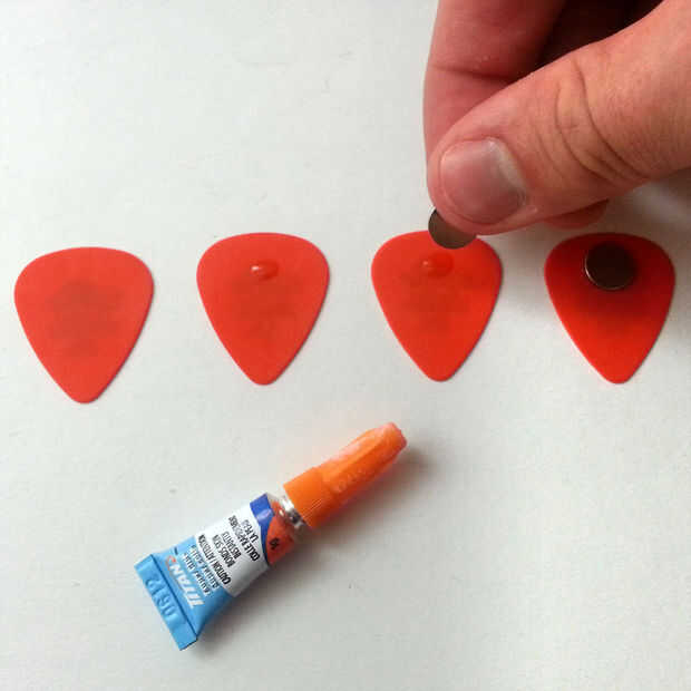 Leí este artículo sobre una empresa que vende selecciones de la guitarra magnética, pero después de ver el precio de una pick fue $4 (no incluye envío) decidí hacer mi propia. Sólo super pegue imanes de neodimio pequeños a la espalda de selecciones de la guitarra, eso es todo! Diseño las diferencias a un lado, recoge fácilmente es dañados o perdidos (con imanes) y quería una alternativa barata a una versión comercial pulida
