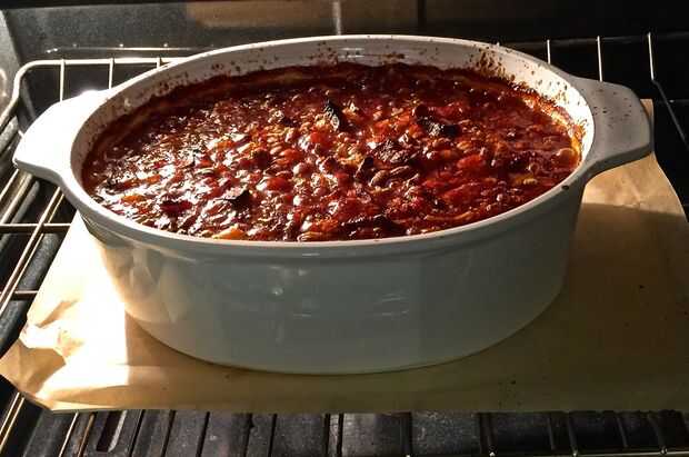 Lento al horno frijoles barbacoa y sur chorizo ahumado