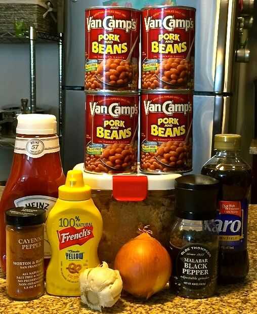 Carne de cerdo y frijoles, drenar el jugo de dos de las latas de frijoles, descartarlo