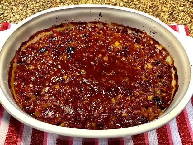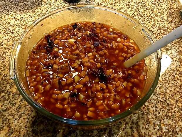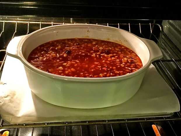 Coloque la cazuela sobre una hoja de galletas forradas y colóquelos en el horno caliente pre. Hornee a 325° F grados 1 1/2 a 2 horas o hasta que las habas estén burbujeantes. Dejar reposar para espesar antes de servir. Rendimiento: 8 a 10 porciones.