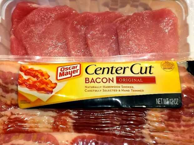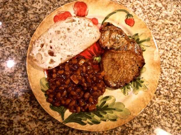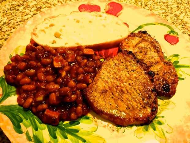 Agregar la chuleta tocino y carne de cerdo a la mezcla de frijoles, mezcle y vierta en un molde enmantecado 2 cazuela de ½ a 3 cuartos engrasado. Coloque el tocino sobre las habas.