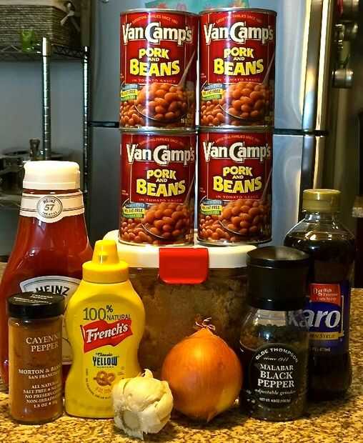 En una gran mezcla de combinar y mezclando la carne de cerdo y salsa de frijoles, azúcar morena, pimienta negra, pimienta de Cayena, jarabe de maíz, amarillo mostaza, cebolla y ajo.
