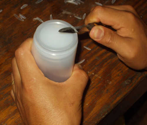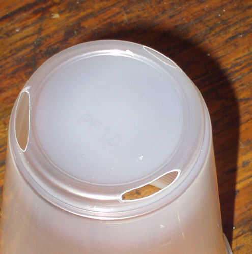Nick el borde inferior de la taza de tres veces. Tenga cuidado de no hacer un agujero demasiado grande, o para macetas suelo saldrá. Si los agujeros son demasiado pequeños, no habrá suficiente drenaje y raíces se ahogan en el agua.