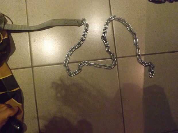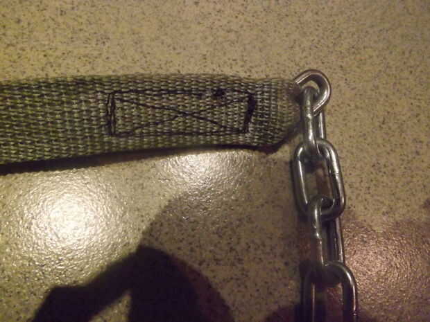 Utilizar la máquina de coser para unir las cadenas de metal al final de las cuerdas.