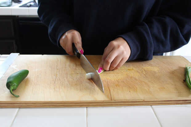 Ahora permite empezar cortando sus ingredientes. Primero comencé con mi cebolla verde. Trató de cortar las rebanadas de cebolla verde finamente, pero exactamente no funcionó hacia fuera. Decidí ir con una cebolla verde porque no es como rasgar sacudidas como una cebolla regular.