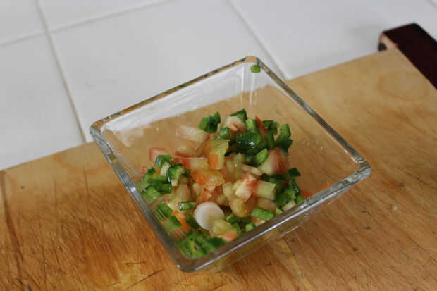 ingredientes:-4 tomates grandes maduros, sin semillas y picado-1/2 taza de cilantro, waashed y picadas-2 dientes de ajo-1 cebolla roja pequeña-1 cucharada de jugo de Lima fresco-caliente salsa (opcional)-2 o 3 pimientos-salPaso 1: Cortar los vegtable