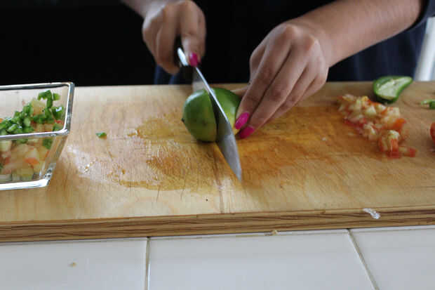 Corte mi limón por la mitad y exprimir hacia fuera el jugo de limón en la salsa. Pico de Gallo es una de las salsas más fácil para hacer. Todo lo que necesitas es cuatro ingredientes y cualquier elemento adicional si quieres. Bueno esto ha sido mi receta y espero que lo disfruten!