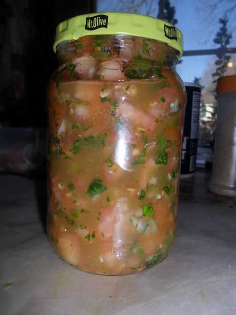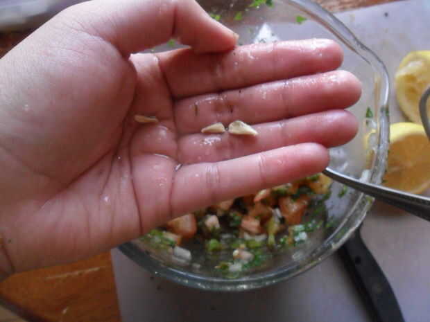 ingredientes:-4 tomates grandes maduros, sin semillas y picado-1/2 taza de cilantro, waashed y picadas-2 dientes de ajo-1 cebolla roja pequeña-1 cucharada de jugo de Lima fresco-caliente salsa (opcional)-2 o 3 pimientos-salPaso 1: Cortar los vegtable