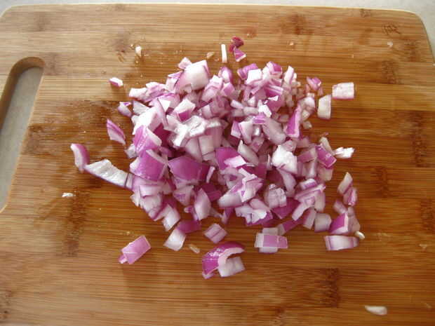 Tomar la otra mitad de la cebolla y coloque el lado plano en la tabla de cortar. Hacer varios cortes verticales, y luego hacer rodajas horizontales. Quiere picar la cebolla, por lo que es muy fina. Por supuesto, si lo prefiere más cachas de la cebolla, puede alterar su tamaño para picar.