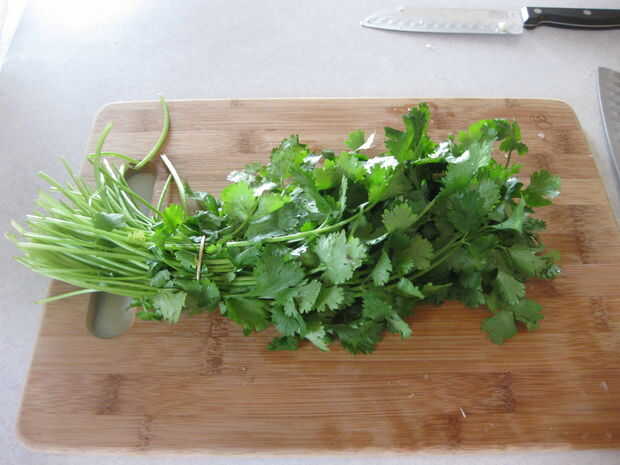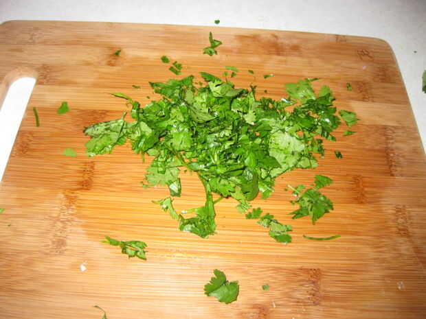 Tomar un manojo de pequeñas y medianas de cilantro. Puede dejar el paquete atado juntos (si lo ha hecho ya). Enjuagar ligeramente el cilantro, y pat secar muy bien con una toalla de papel. Si está demasiado húmedo, será más difícil de cortar. A continuación, finamente picar las hojas de cilantro y corte los tallos largos. No es necesario picar el cilantro, una fina tajada es bueno.