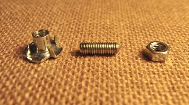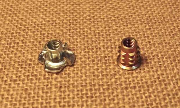 1. una tuerca en T (a la izquierda en la primera foto), o inserto roscado (a la derecha en la foto). Un inserto roscado ocupa un área más pequeña y es una conexión más segura, pero es más difícil de trabajar, por lo que generalmente prefiero el T-nut. Aquí he uso uno con un hilo de rosca de 6 mm interior.