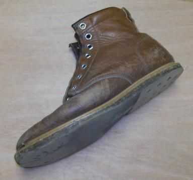 Serrar el talón de cada bota de trabajo incluso con la parte inferior de su suela. Utilicé una sierra de banda a mano alzada.