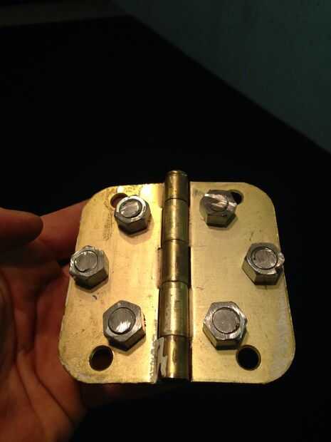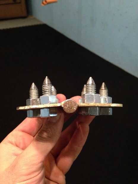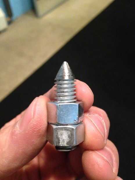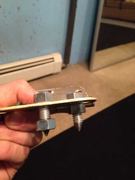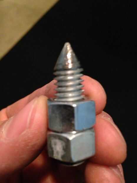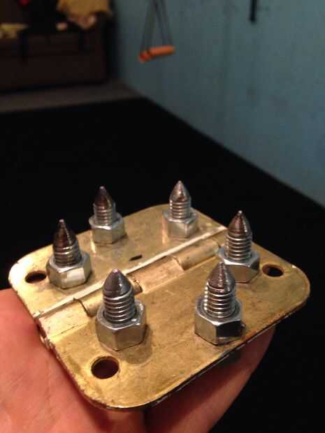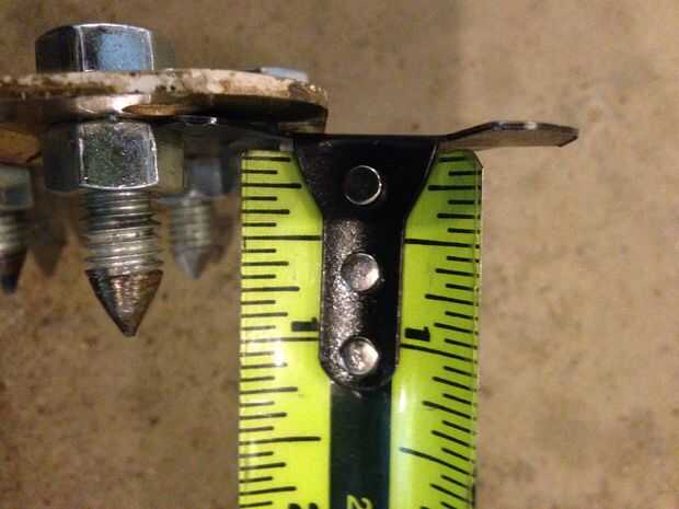 Es la forma más fácil para hacer los picos afilar la varilla roscada primero (tenía 12 piezas de 6" de largo) con un disco de pulir en una amoladora. Una esmeriladora de banco funcionaría mejor. Luego poner una tuerca en el lado de spike entonces a través del orificio de la bisagra y midió un pico de 1" de largo. Otra tuerca fue apretada en la parte posterior y la barra de corte al ras de la tuerca. Asegúrese de que tener los picos en el lado más plano de las bisagras y el pasador de la bisagra hacia arriba hacia el maletero. Son una buena longitud pero incluso podría recortarlo a 3/4". ¡ BAM! Eso es casi todo, sólo hay una manera de sujetar a las botas...