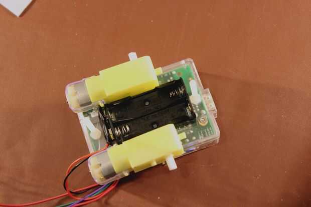 Sin usar ninguna de la cinta de doble cara adhesiva, alinee el soporte de la batería y los motores en la parte posterior de la caja. Asegúrese de que hay suficiente longitud en los cables para conectar el soporte de la batería y los motores.