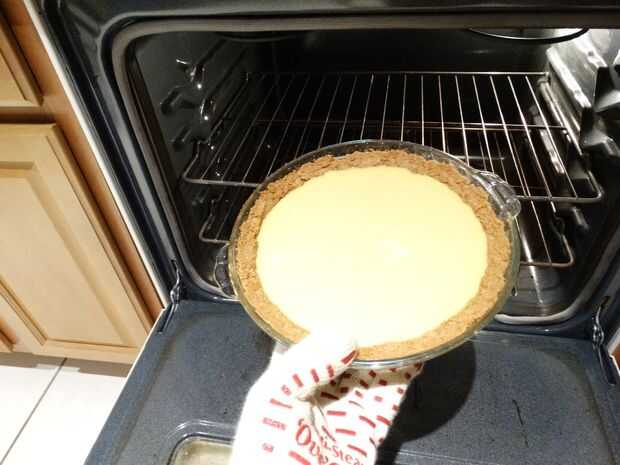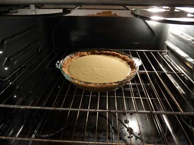 Tomar el preparado y enfriado (no tiene que ser fría) pastel de corteza y verter el relleno de la empanada. Darle una sacudida poco a estimular las burbujas de aire hacia fuera. Colocarla en el horno de 350 grados F (177 grados C) durante 12 minutos.