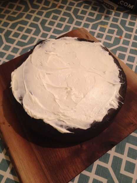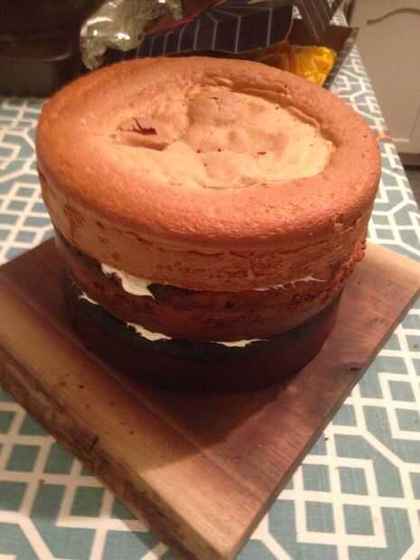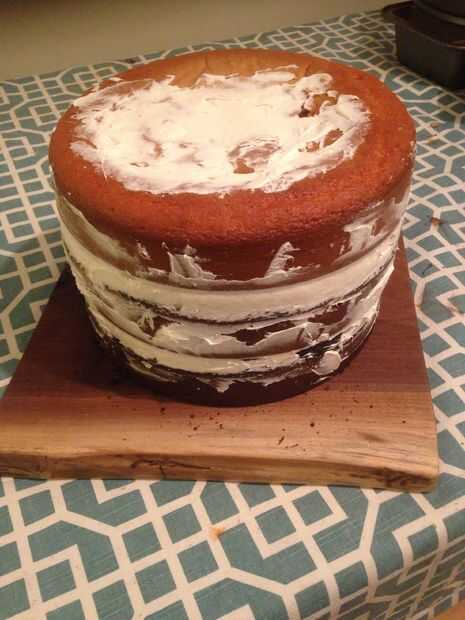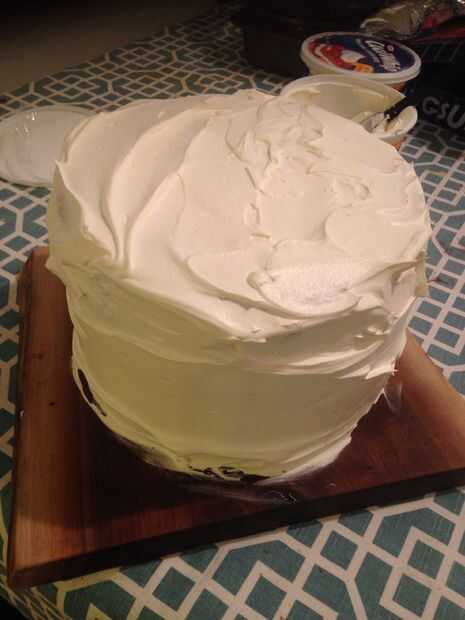Coloca una pequeña capa de crema batida en cada capa y llené y huecos en el lado. Puede usar frosting, crema de mantequilla o incluso fondant, pero encontré que la crema batida fue justo. No a dulce y no a denso.